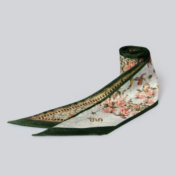 €38.00Tra le sfumature del verde si stagliano delle pennellate rosa chiaro che donano un tocco di luce e romanticismo a questo foulard dai toni delicati.