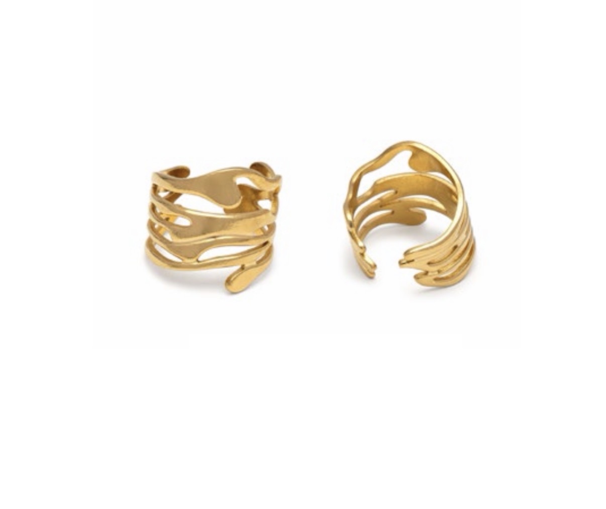 Anello in acciaio gold plated. Questo gioiello è caratterizzato da curve fluide che ricordano il movimento dell’acqua, per un look morbido e raffinato. Il design è pensato per fare la differenza su look casual o tagli eleganti, e si impone come vera e propria dichiarazione di creatività e stile. Il modello è una fascia regolabile indossabile come statement piece o con altre fasce per outfit audaci. Nickel tested.