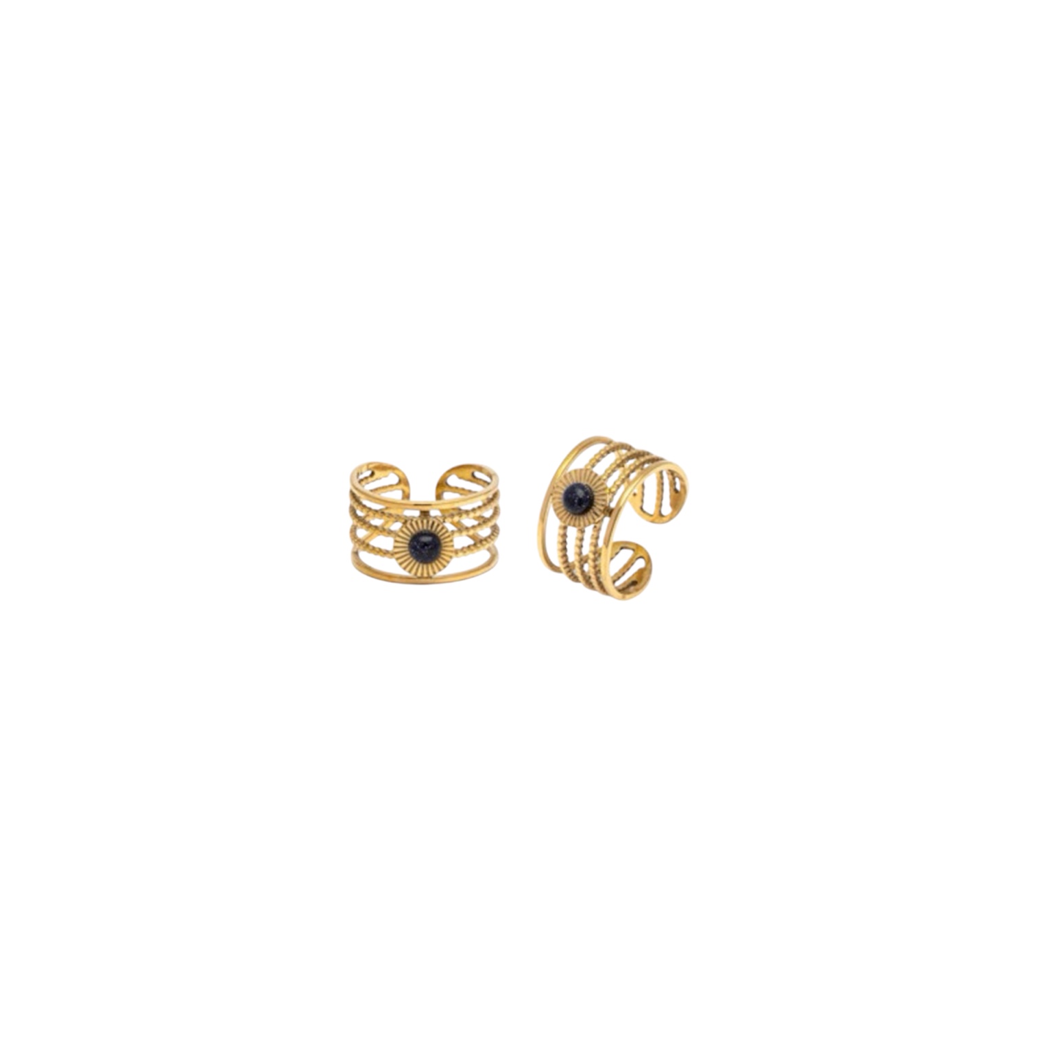 Anello in acciaio gold plated e sandstone (pietra blu notte dall’effetto glitterato).