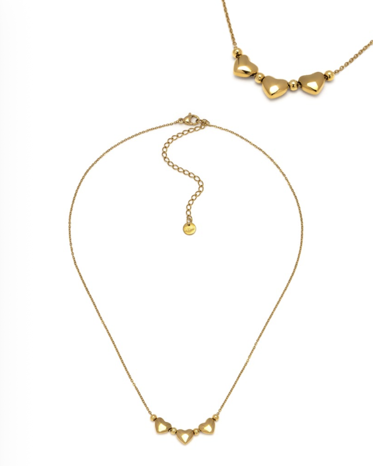 Collana in acciaio gold plated modello ultra fine con tris ciondoli a forma di cuore, discreti ma luminosi. Un dettaglio semplice che si abbina facilmente a dress eleganti o look casual. Chiusura regolabile con moschettone. Lunghezza collana 39 cm. Lunghezza extra chain 5 cm. Nickel tested.