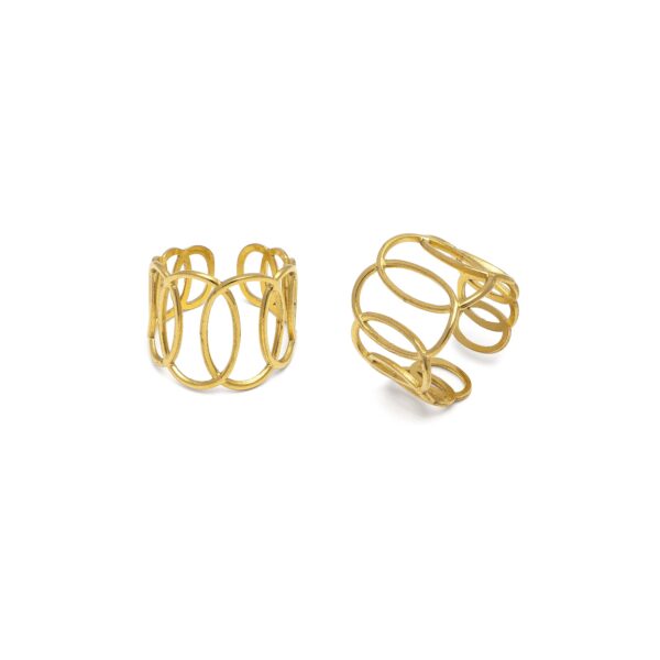 Anello in acciaio gold plated. Questo gioiello alterna pieni e vuoti in una struttura traforata romantica e moderna. Regolabile e leggero, si adatta perfettamente a ogni stile e può essere indossato da solo o in stack delicati. Nickel tested.