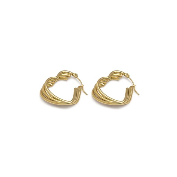 Orecchini in acciaio gold plated modello c hoop con texture cuori intrecciati. Questi orecchini giocano con curve fluide e volumi sovrapposti per un effetto unico. Scultorei e leggeri, sono ideali da soli o mixati in un earrings stack originale dal finish romantico. Chiusura a baionetta. Nickel tested.
