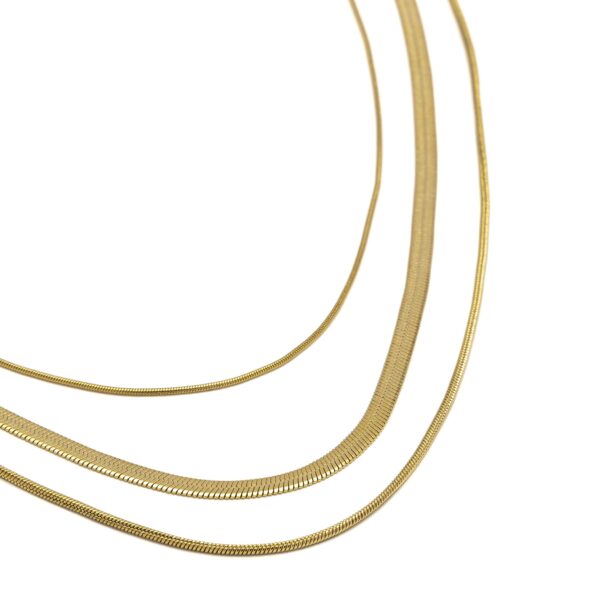 €19.50Collana in acciaio gold plated modello snake 3 fili. Questo gioiello è caratterizzato da tre layering con diverse lunghezze e maglie: tonda, flat small e flat big. Un mix dinamico e di tendenza per costruire layering looks in poche mosse. Ideale per chi ama giocare con volumi e sovrapposizioni indossando un solo gioiello iconico. Chiusura regolabile con moschettone. Lunghezza collana: 40 cm, 45 cm, 50 cm. Lunghezza extra chain 5 cm. Nickel tested.