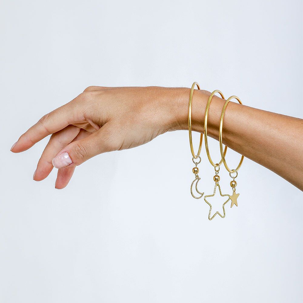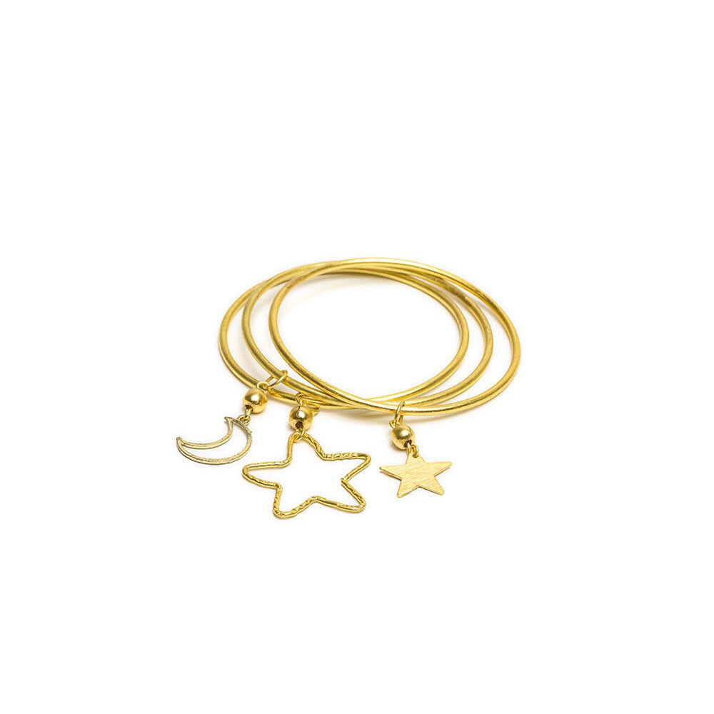 Bracciale rigido con ciondoli stella e luna. Lavorazione artigianale.