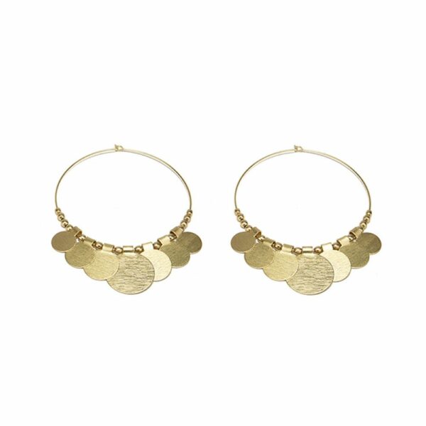 Orecchini cerchio con placche circolari pendenti. Lavorazione artigianale.